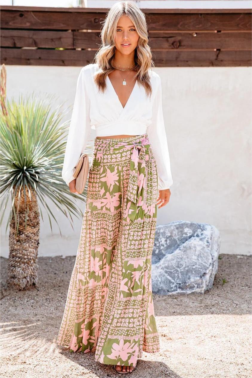 How iconic is the color and print on our A World To See Floral Tie Front Wide Leg Pants? These pink and lime green pants have an ultra wide leg and a flattering. smocked waist. Finished with a sewn adjustable waist tie. Styled with the Michaela Hoops. Circlet Disc Choker. 5 Disc Choker. Moxie Simple Chain Necklace. Initial Card Necklace. Simple Bangle Bracelet. Stella Crossbody Envelope Zip Clutch. Vittoria Tie Front Crop Blouse. and Whimsy Heel.