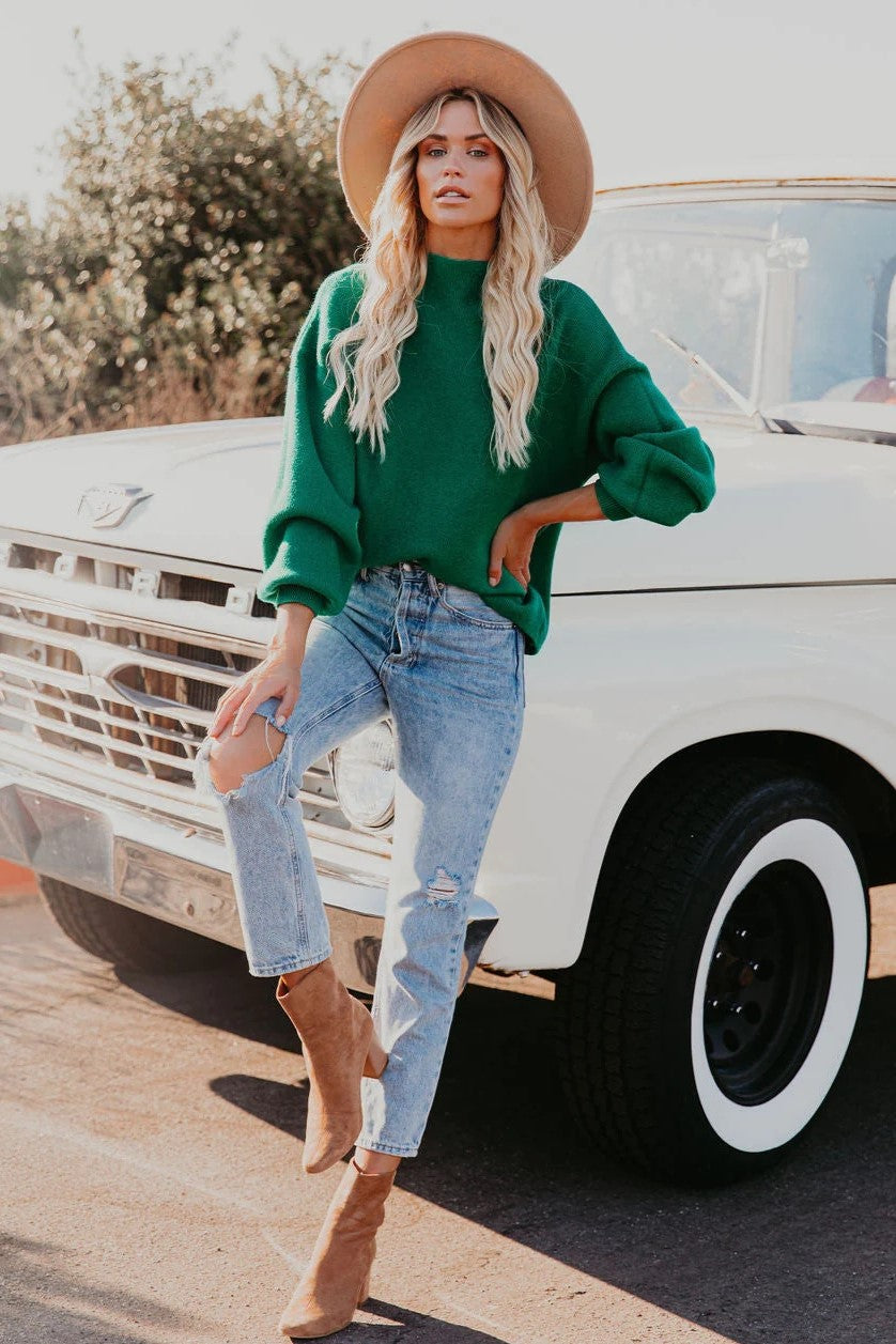 Our Amsterdam Mock Neck Sweater adds a sophisticated-chic look to your sweater wardrobe! This fine kelly green knit sweater is crafted with a beautiful luxe weight that drapes effortlessly in a relaxed fit. Designed with a mock neckline and billowy long sleeves. Pair yours with classic denim and heels for an office chic look!