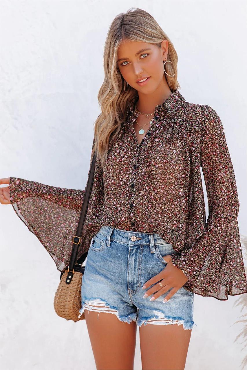 Go for a chic office vibe in our Balayage Printed Bell Sleeve Blouse! This black. red. fuchsia. yellow. sage. and ivory printed blouse tucks flawlessly into denim. Designed with a collar and bell sleeves. Styled with the Perfect Hoop Earrings. Elena Pendant Necklace. Compass Coin Necklace. Chloe Mini Necklace. Simple Bangle Bracelet. Hillock Rattan Tassel Crossbody Handbag. Hazel High Rise Distressed Denim Shorts. and Cooper Block Heeled Sandal.