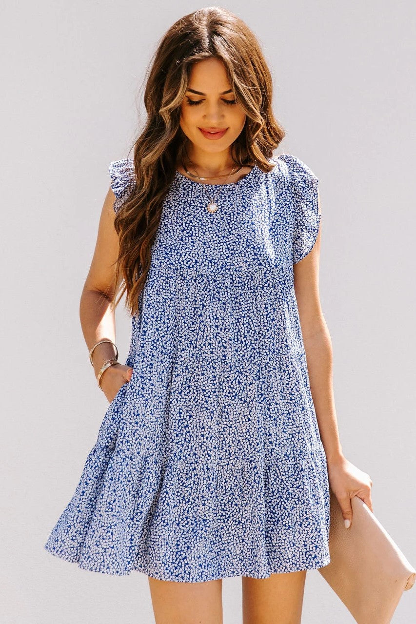 Dream of frolicking in floral fields in our Blue Ivy Pocketed Tiered Babydoll Tunic! A white and blue floral print makes up this girl babydoll dress. With flutter sleeves and a tiered body. this piece is comfortable and cute. Finished with a back button closure. Styled with the Accent Herringbone Necklace. Rising Sun Pendant Necklace. Stella Crossbody Envelope Zip Clutch. and Ritz Faux Suede Pointed Heel.