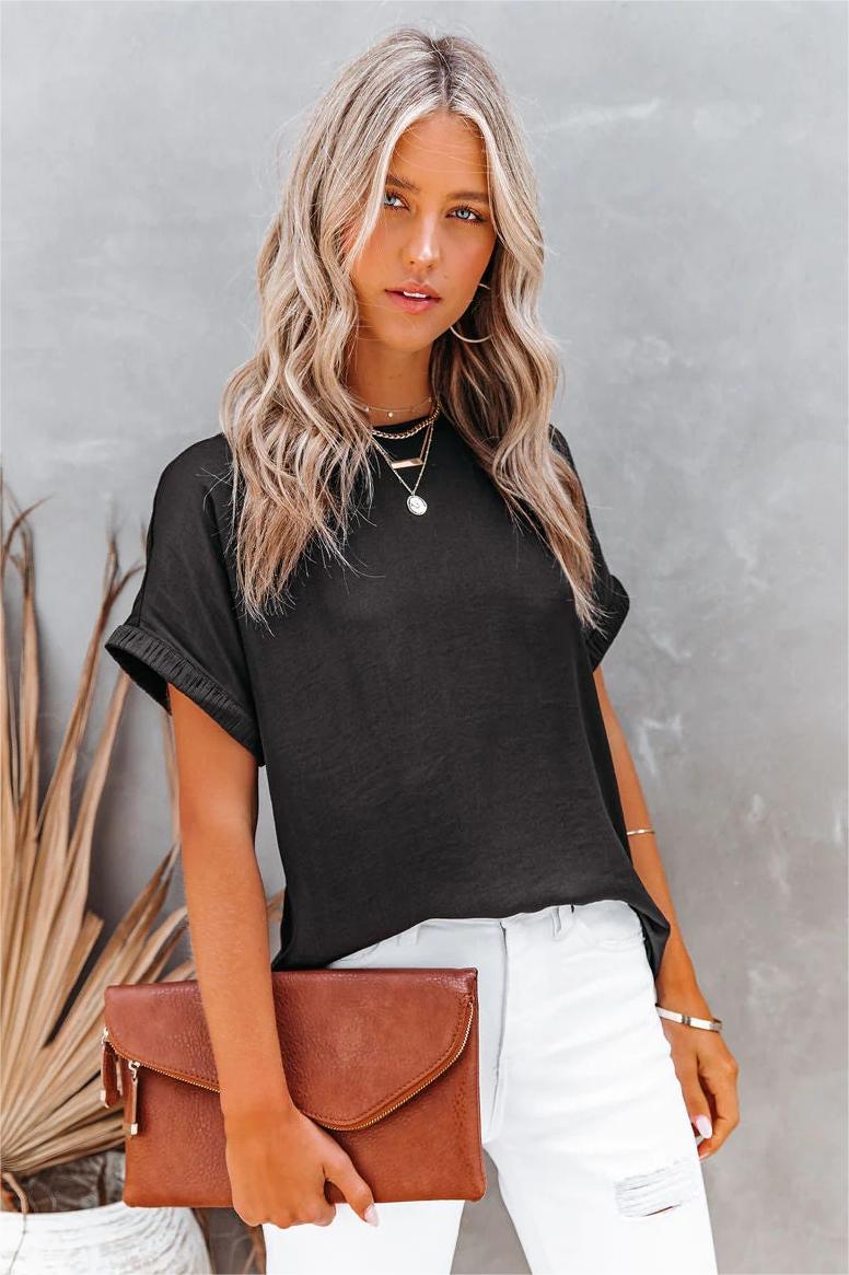 We adore the breathability of a satin blouse! Our Bond Short Sleeve Satin Blouse is a silky black hue designed with a crew neckline. Finished with a back button closure with a keyhole. Styled with the Perfect Hoop Earrings. 5 Disc Choker. Bar Necklace. Moxie Simple Chain Necklace. Compass Coin Necklace. Simple Bangle Bracelet. Stella Crossbody Envelope Zip Clutch. Brenna High Rise Distressed Slim Straight Denim. and Bella Faux Leather Strappy Kitten Heel.