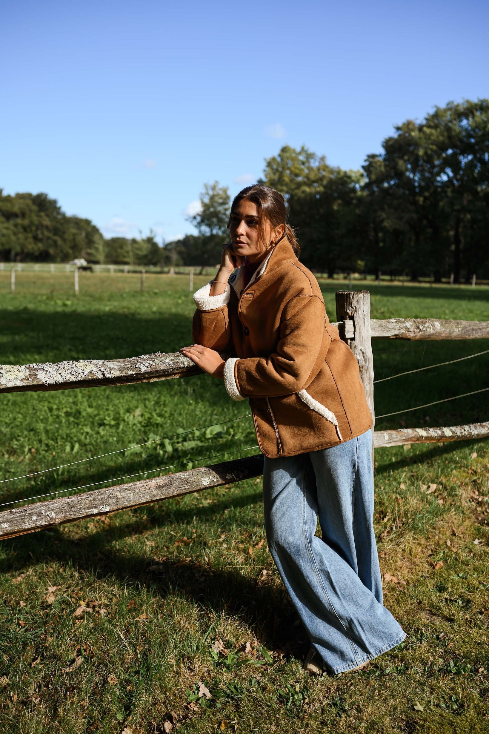 Wrap yourself in warmth with the Camel Shearling Ninho Coat. This reversible design combines soft ecru sheepskin on one side and smooth camel suede on the other, offering two stylish looks in one. Featuring a high collar, button placket, and side pockets, it’s the ultimate blend of comfort and sophistication.