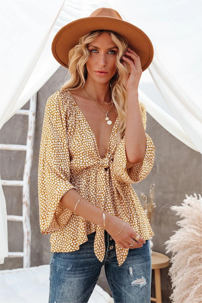Look cute in the office in our Carrison Floral Tie Front Peplum Top! This mustard and white floral top is secured with a tie front. We adore how this peplum top pairs with denim and booties. Styled with the El Dorado Hat. Perfect Hoop Earrings. Chloe Mini Necklace. Compass Coin Necklace. Sia Toggle Pendant Necklace. Simple Bangle Bracelet. On The Fly Crossbody Bag. Ultimate High Rise Split Ankle Distressed Skinny. and Tip Top Faux Suede Kitten Heel Mule.