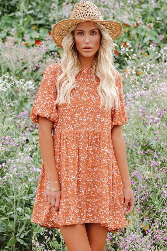 Our Faded Memories Floral Puff Sleeve Babydoll Tunic delivers such feminine vibes! This gorgeous dusty orange dress features a white. peach. and rust print. Finished with a back button closure. Styled with the Leone Straw Panama Hat. Lauren Chain Cuff. Simple Bangle Bracelet. and Marley Heeled Straw Sandal.
