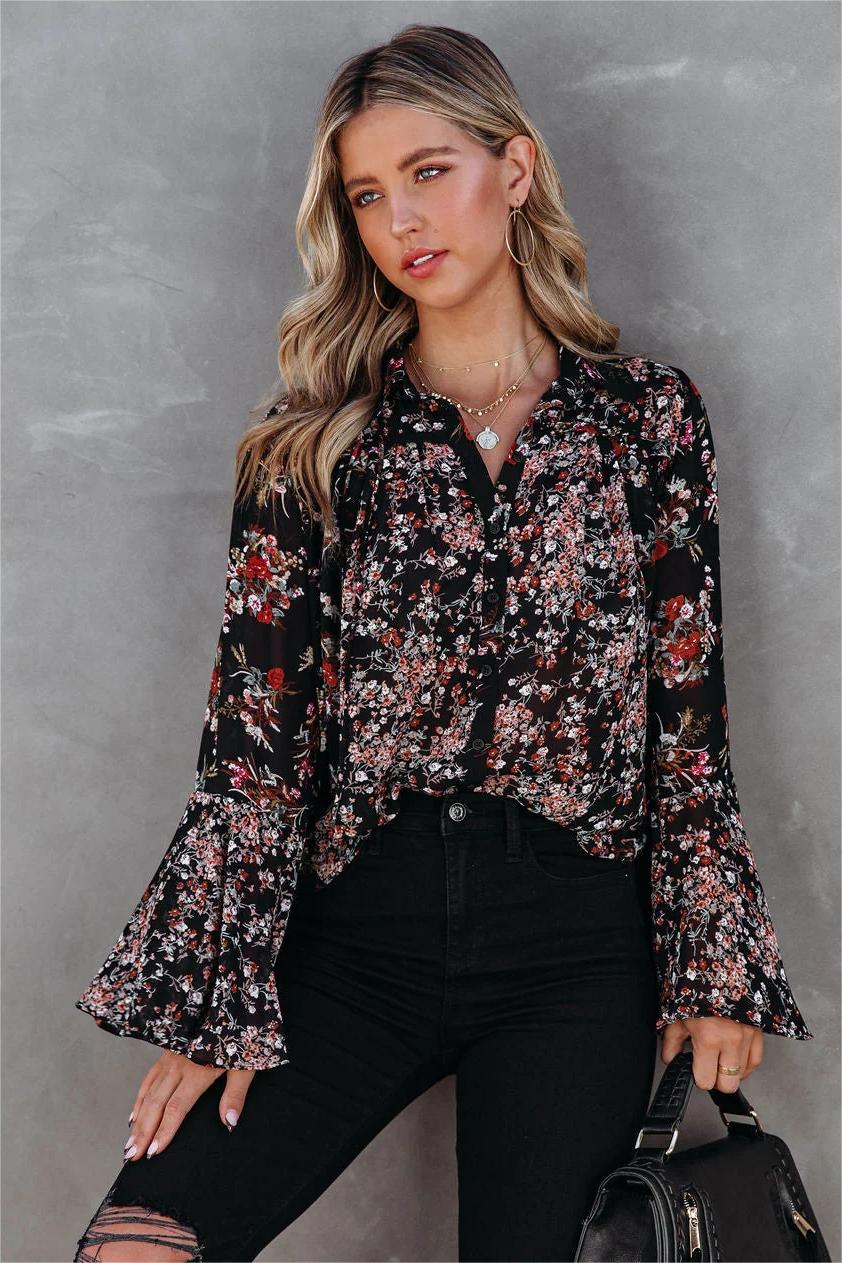 Our Find Love Again Floral Bell Sleeve Blouse is party ready! This black top features rust. wine. olive. dusty blue. and taupe florals. Finished with a button down front. Styled with the Perfect Hoop Earrings. 5 Disc Choker. Chloe Mini Necklace. Gaia Coin Necklace. Simple Bangle Bracelet. Highland Bag. Ashby High Rise Distressed Bell Bottom Denim. and Whimsy Heel.