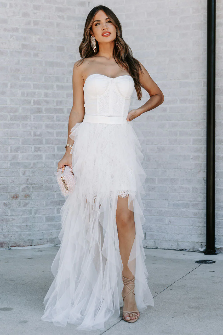 Major Ballerina Vibes in the For Eternity Tulle Ruffle Maxi Skirt in white that features a side slit.