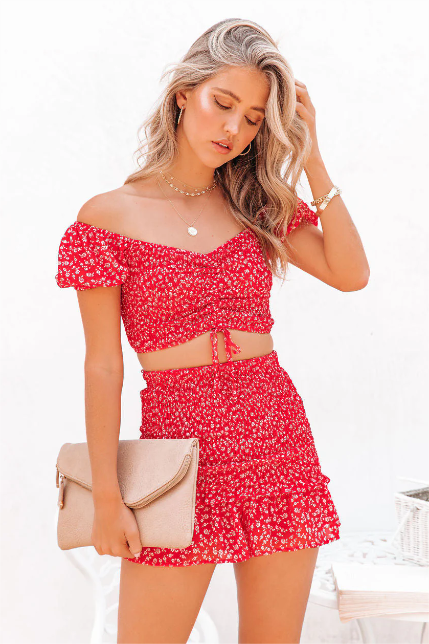 We adore the girly vibes of this floral printed set! Our Forever After All Floral Smocked Skort looks best with the matching top and nude or white heels. This red and white piece features a ruffled hem. Styled with the French Twist Hoops. 5 Disc Choker. Shayne Gold Link Necklace. Compass Coin Necklace. Stella Crossbody Envelope Zip Clutch. Simple Bangle Bracelet. Lexie Chain Cuff. Forever After All Floral Smocked Crop Top. and Twiggy Criss Cross Heeled Sandal.