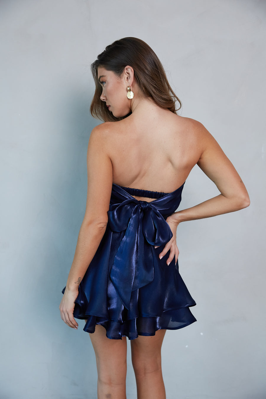 Be the life of the party in the Gabby Strapless Twist Front Babydoll Dress! This sweet and sassy mini dress is made of eye-catching shimmering fabric and features a babydoll silhouette, strapless twist front bust with a keyhole detail, adjustable bow back, and a two-tiered skirt. Available in chambray, berry, and white. Pair with a cute heel you can dance the night away in!