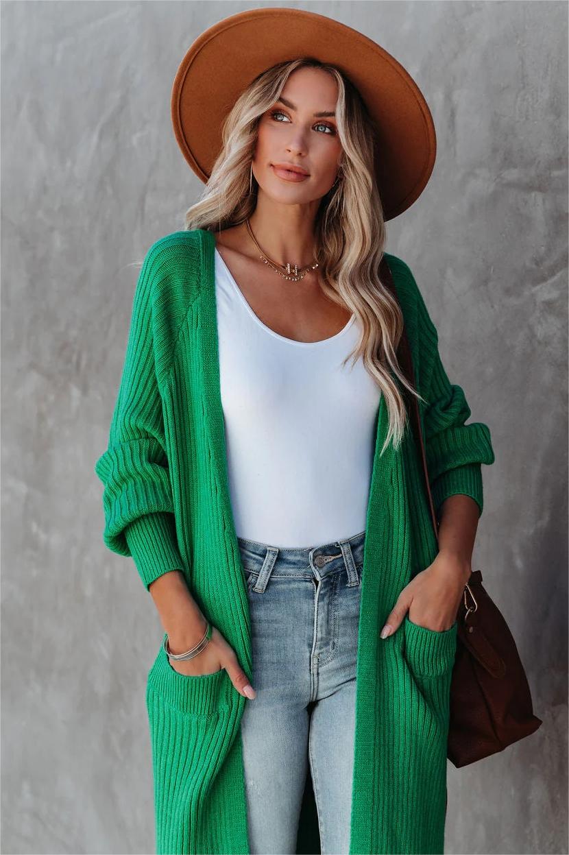Green Ribbed Knit Long Cardigan
