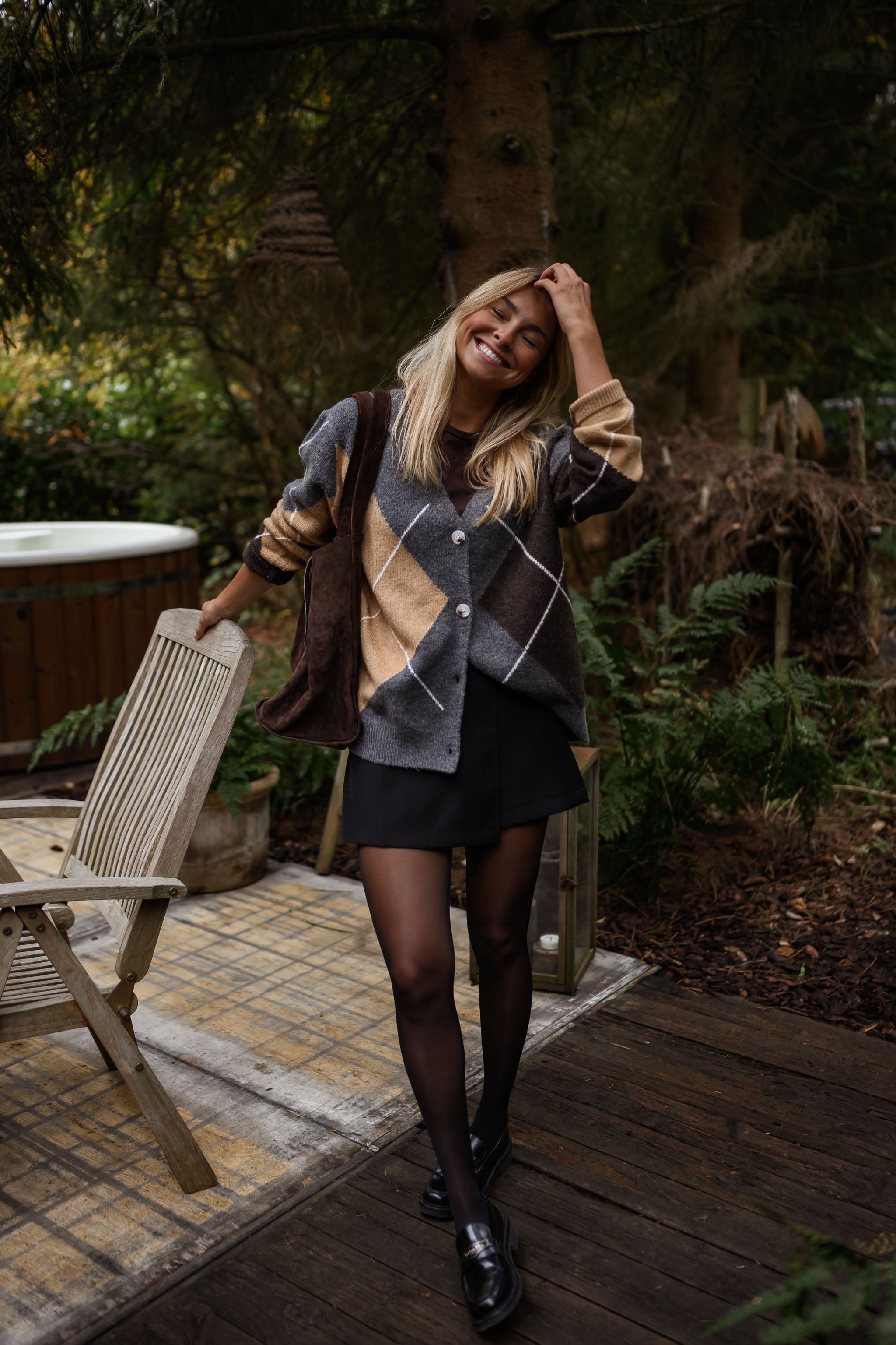 Add a cozy, patterned touch to your wardrobe with the Grey Checkered Georgia Cardigan. Featuring long sleeves, button plackets, and a mix of beige, brown, and ecru jacquard patterns, this slightly loose cardigan combines classic charm with effortless style.