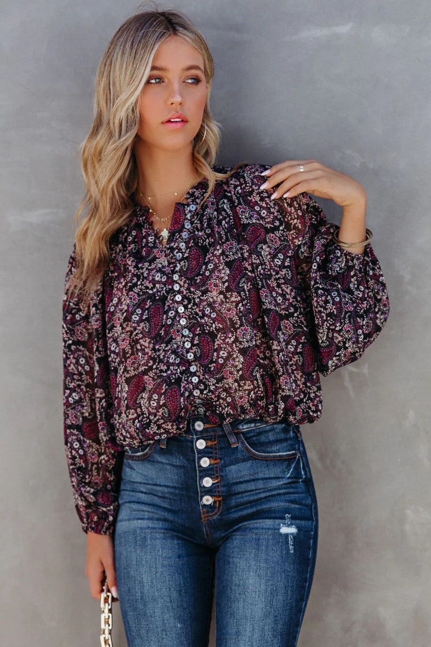 Our Hawthorn Printed Button Down Crop Blouse is perfectly patterned! This black. burgundy. rust. and off white paisley top is crafted with a button down front. Finished with a split neckline. Styled with the Perfect Hoop Earrings. 5 Disc Choker. Chloe Mini Necklace. Gaia Coin Necklace. Simple Bangle Bracelet. Chic Crossbody Chain Pouch Bag. Tilley Frayed Ankle High Waisted Skinny. and Whimsy Heel.