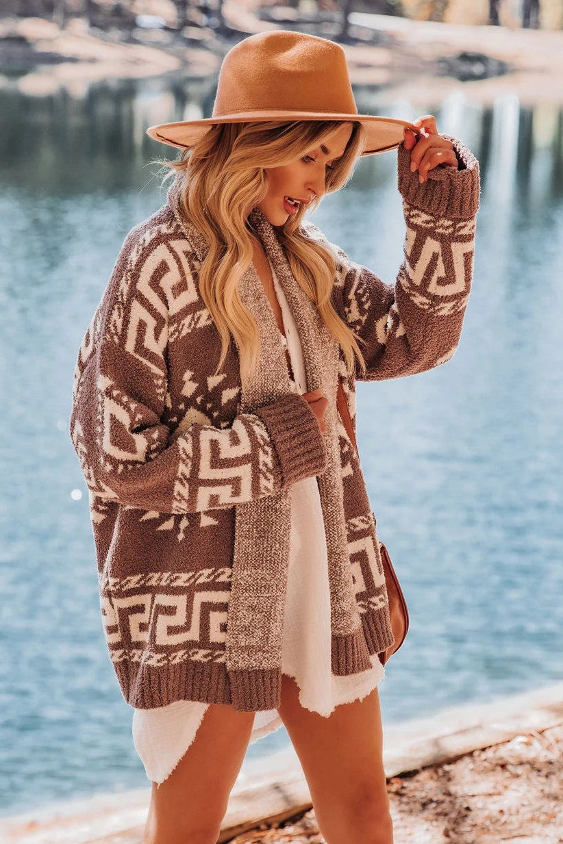 Our Hemlock Soft Knit Cardigan was made to be worn fireside! This mocha and ivory patterned cardi was made in the coziest knit ever. Designed with a shawl neckline and an open front. Styled with the El Dorado Hat. Tahiti Hoops. The Buddha Wheel Necklace. Highland Bag. Kennedy Cotton Pocketed Button Down Tunic and Legend Faux Leather Western Boot.