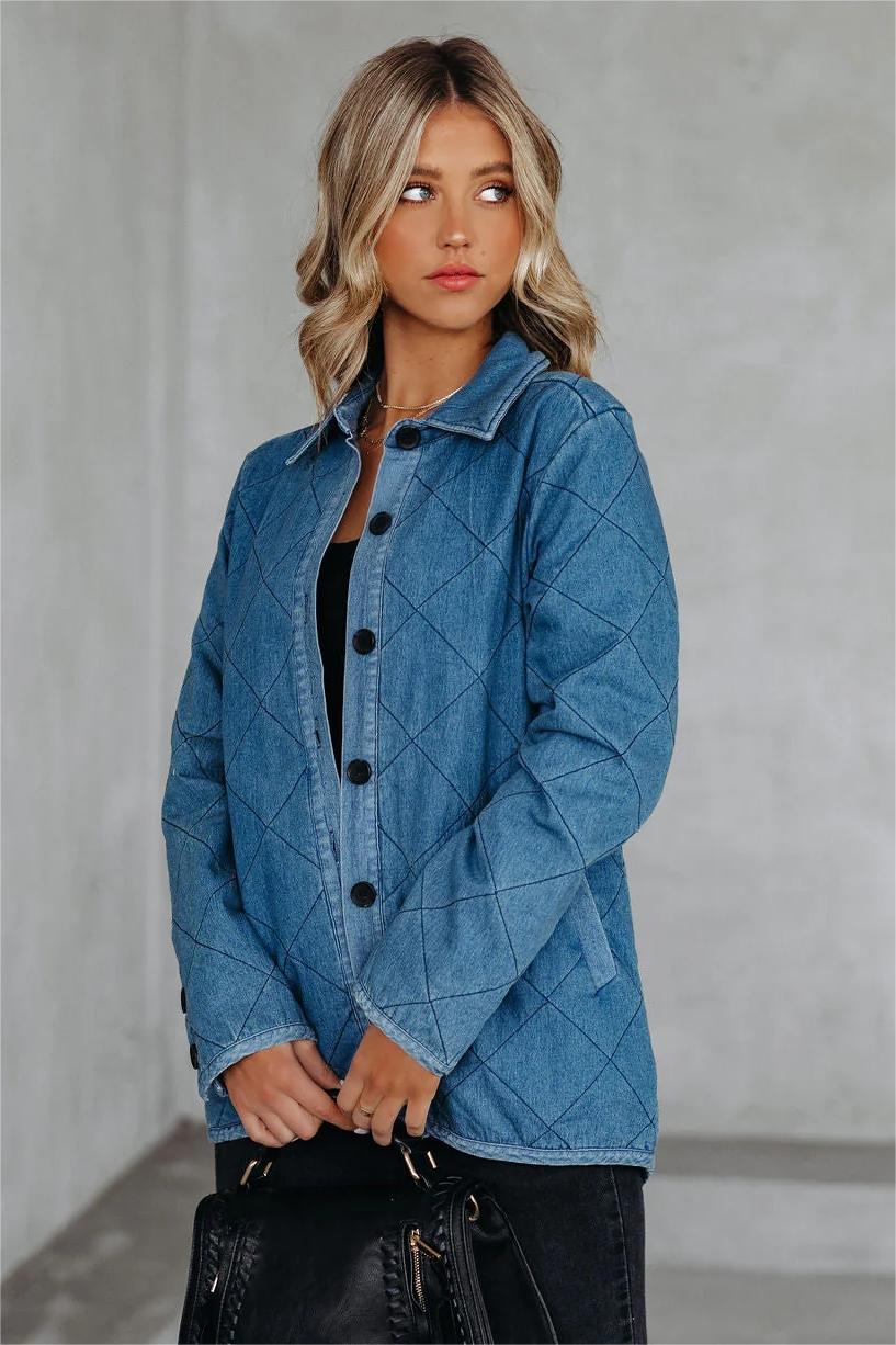 Our Jonny Cotton Blend Pocketed Quilted Jacket is a throw on and go look! This denim blue quilted jacket features a collar. Designed with side pockets and front button closures. Styled with the Physique Racerback Tank. Volt High Rise Distressed Skinny. Brycen Faux Leather Lace Up Boot. Highland Bag. Mosaic Coin Necklace. Chloe Mini Necklace. and Perfect Hoop Earrings.