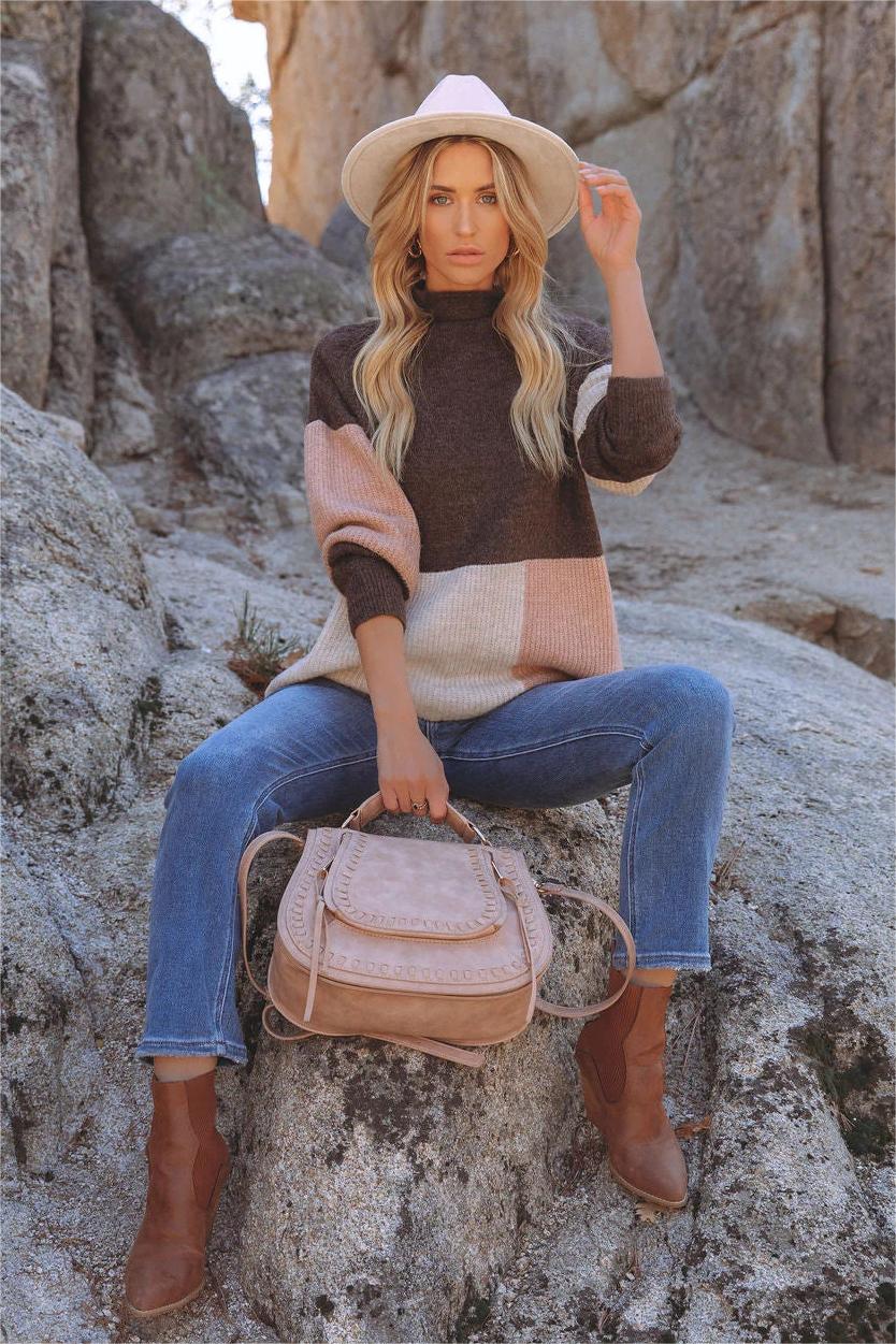 Our Kidman Colorblock Mock Neck Sweater has an elevated vibe! Brown. beige. and mauve colorblock hues detail this top. Designed with a mock neckline and long sleeves. Styled with the Reggie Fedora Hat. Tahiti Hoops. Highland Bag. Benji High Rise Slim Straight Denim. and Jocelyn Heeled Bootie.