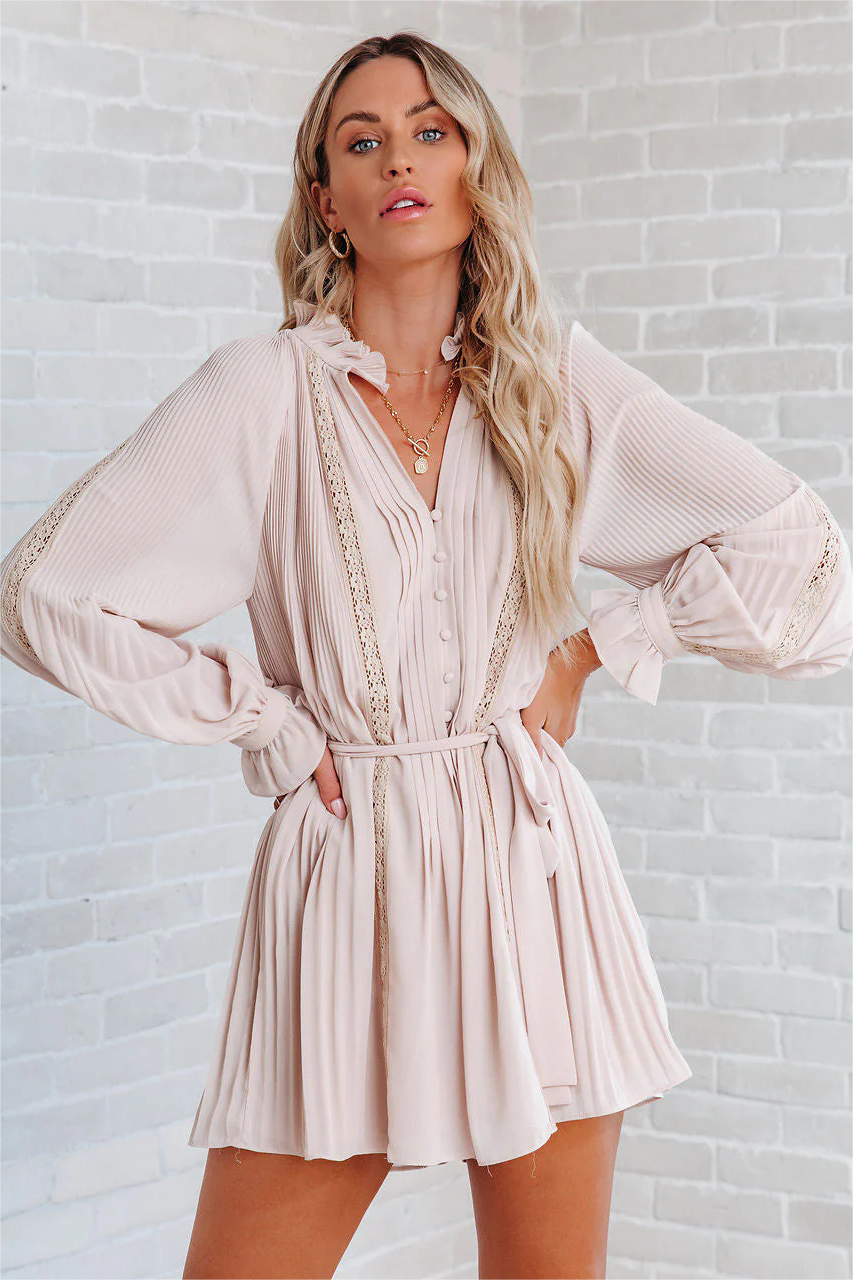 Ruffled sleeves are so flirt forward! Our Lovelle Lace Plisse Romper comes in a pretty beige hue. Designed with front button closures and a lace trim. Finished with an adjustable waist tie. Styled with the Gabi Hoops. 5 Disc Choker. Sia Toggle Pendant Necklace. Simple Bangle Bracelet. Stella Crossbody Envelope Zip Clutch. and Saint Slouch Boot.