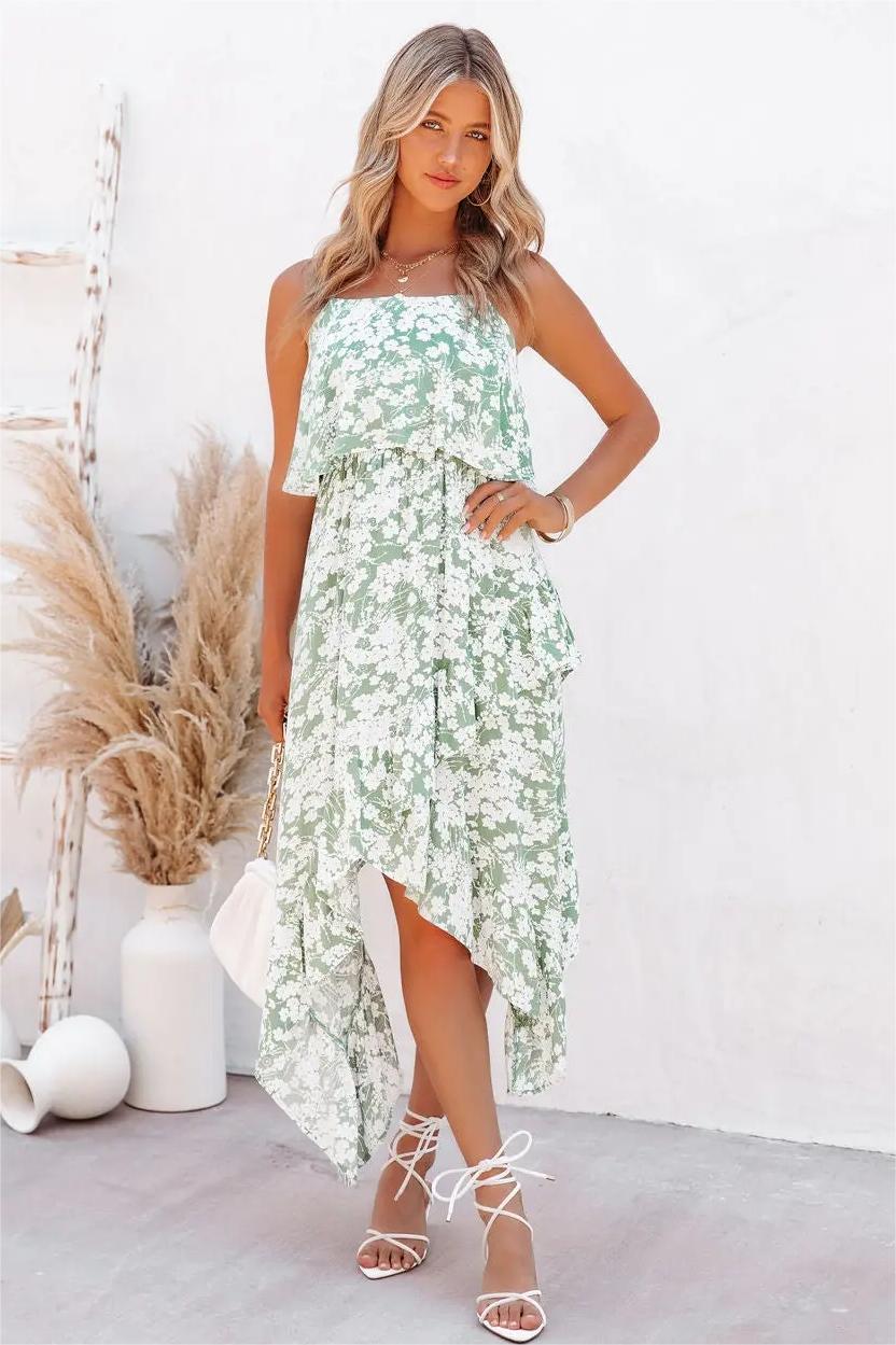 Soak up the last summer sunset in our Maeve Floral Asymmetrical Midi Dress! This sage hued beauty features a flowy top shelf and an asymmetrical hemline. Finished with adjustable tie spaghetti straps. Styled with the Perfect Hoop Earrings. Chloe Mini Necklace. Elena Pendant Necklace. Compass Coin Necklace. Simple Bangle Bracelet. Chic Crossbody Chain Pouch Bag. and Bella Faux Leather Strappy Kitten Heel.
