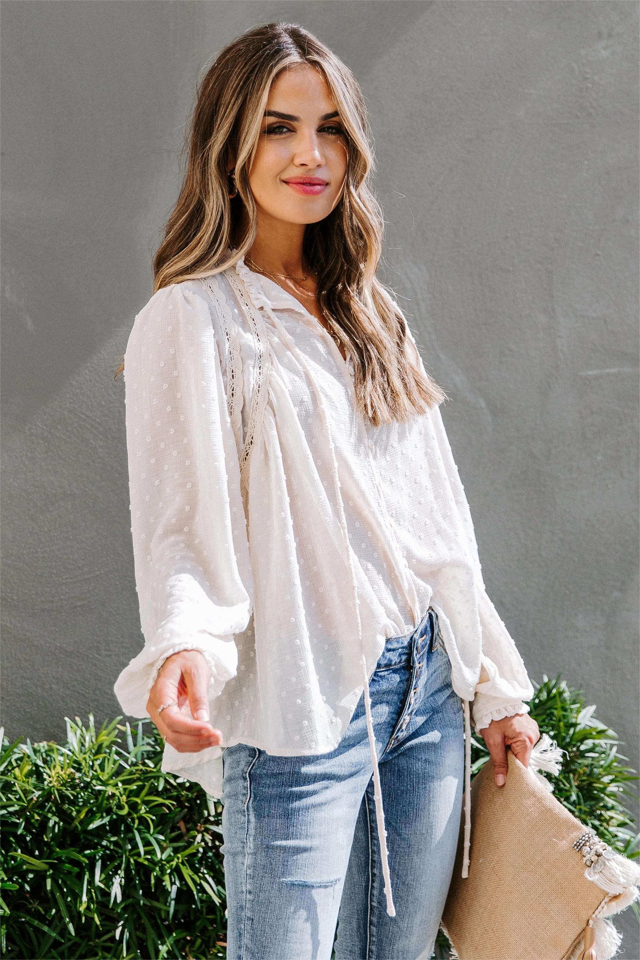 Our Maxine Swiss Dot Crochet Detailed Blouse features a gorgeous sheer cream base that offers texture and silver metallic detail throughout. Designed with a split neckline. neckties and a blousy relaxed fit. Front button closures and dainty crochet trim details with a luxe finish! Styled with the Milan Twist Hoops.Child's Play Choker. Compass Coin Necklace. Glory Bangle Bracelet.Liberation Distressed Girlfriend Skinny. Larkin Heels and the Shashi Leela Clutch.