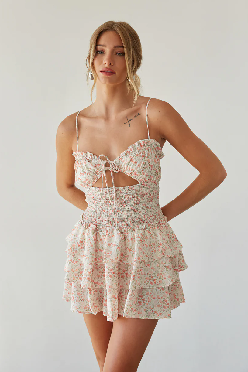Ready, set, bloom in the Mirabelle Floral Keyhole Cutout Romper this Summer! This dress romper features a flattering smocked waist, flirty keyhole cutout, and flouncy tiered ruffle skirt!