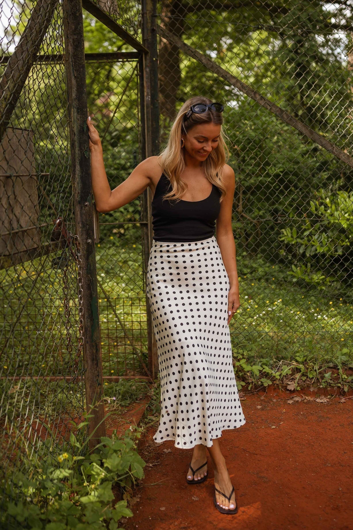 Add charm to your outfit with the Polka Dot Print Midi Skirt. Featuring a flowing long silhouette in satin-effect fabric, it showcases classic black polka dots on an ecru background. The side pull closure ensures ease, while the delicate black embroidery along the waistband adds a refined touch. Unlined but non-sheer, it’s a standout piece that pairs beautifully with your favorite tops.