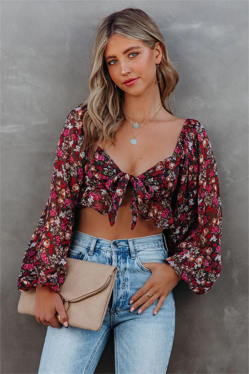Your newest Friday night top! Our My Oh My Floral Tie Front Crop Blouse features black. fuchsia. magenta. white. grey. burnt orange. blush. olive. lime. and red florals. Finished with a tie front. Styled with the Perfect Hoop Earrings. Chloe Mini Necklace. Compass Coin Necklace. Gaia Coin Necklace. Simple Bangle Bracelet. Stella Crossbody Envelope Zip Clutch. Kason Distressed High Rise Denim. and Ritz Faux Suede Pointed Heel.