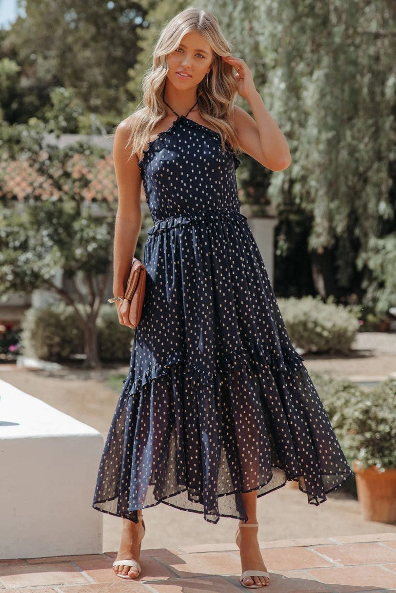 Stand out at your next event in our Remarkable Metallic Detailed Halter Midi Dress! This navy halter midi is detailed with gold metallic polka dots. Designed with a ruffle trim and a lined inner. Styled with the Perfect Hoop Earrings. Stella Crossbody Envelope Zip Clutch. and Whimsy Heel.