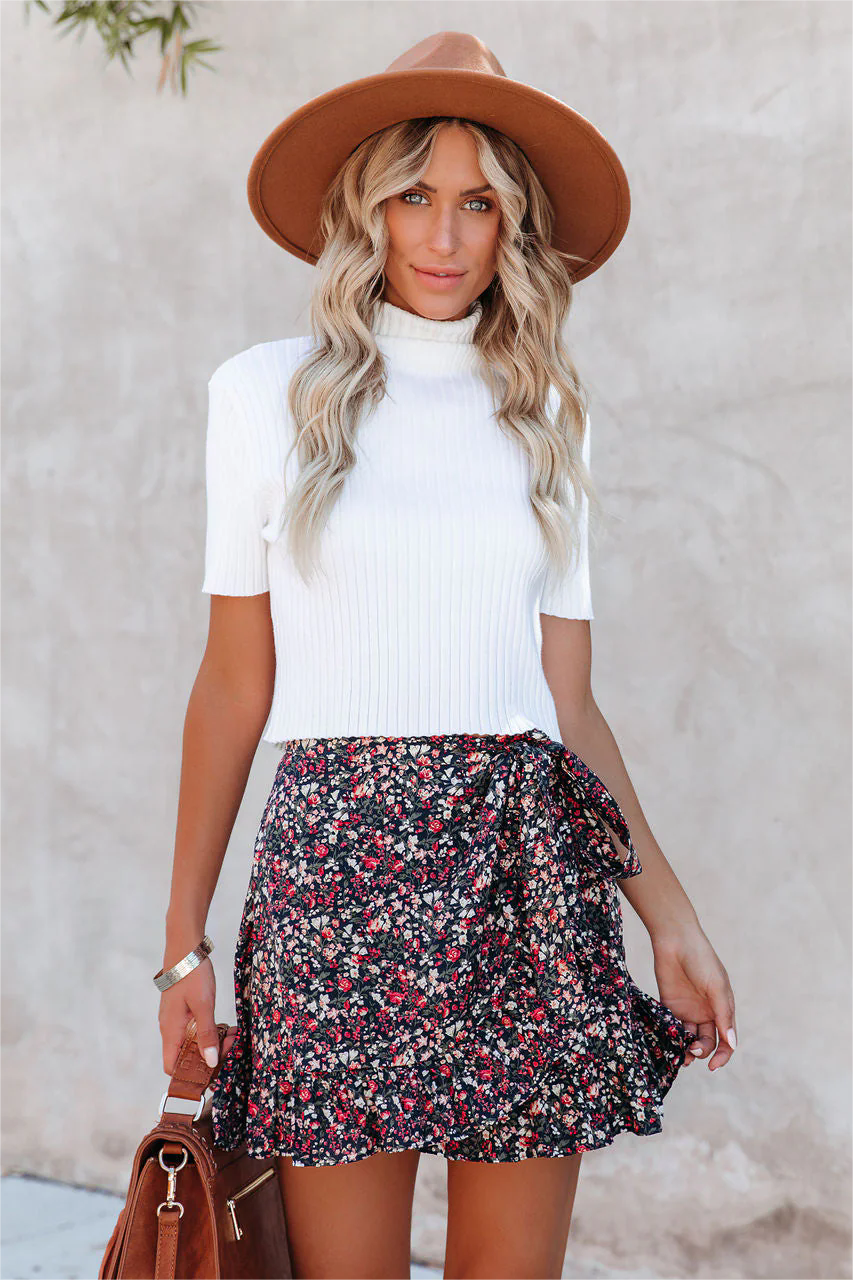 Our Ryan Floral Ruffle Mini Skirt looks so cute with a sweater and OTK boots! This navy. cream. olive. fuchsia. and wine floral mini is crafted with a ruffled hemline. Secured with an adjustable waist tie. Styled with the Rocky Mountain Hat. Perfect Hoop Earrings. Simple Bangle Bracelet. Highland Bag. Janice Ribbed Crop Turtleneck Top. and Teagan Faux Leather Heeled Slouch Boot.