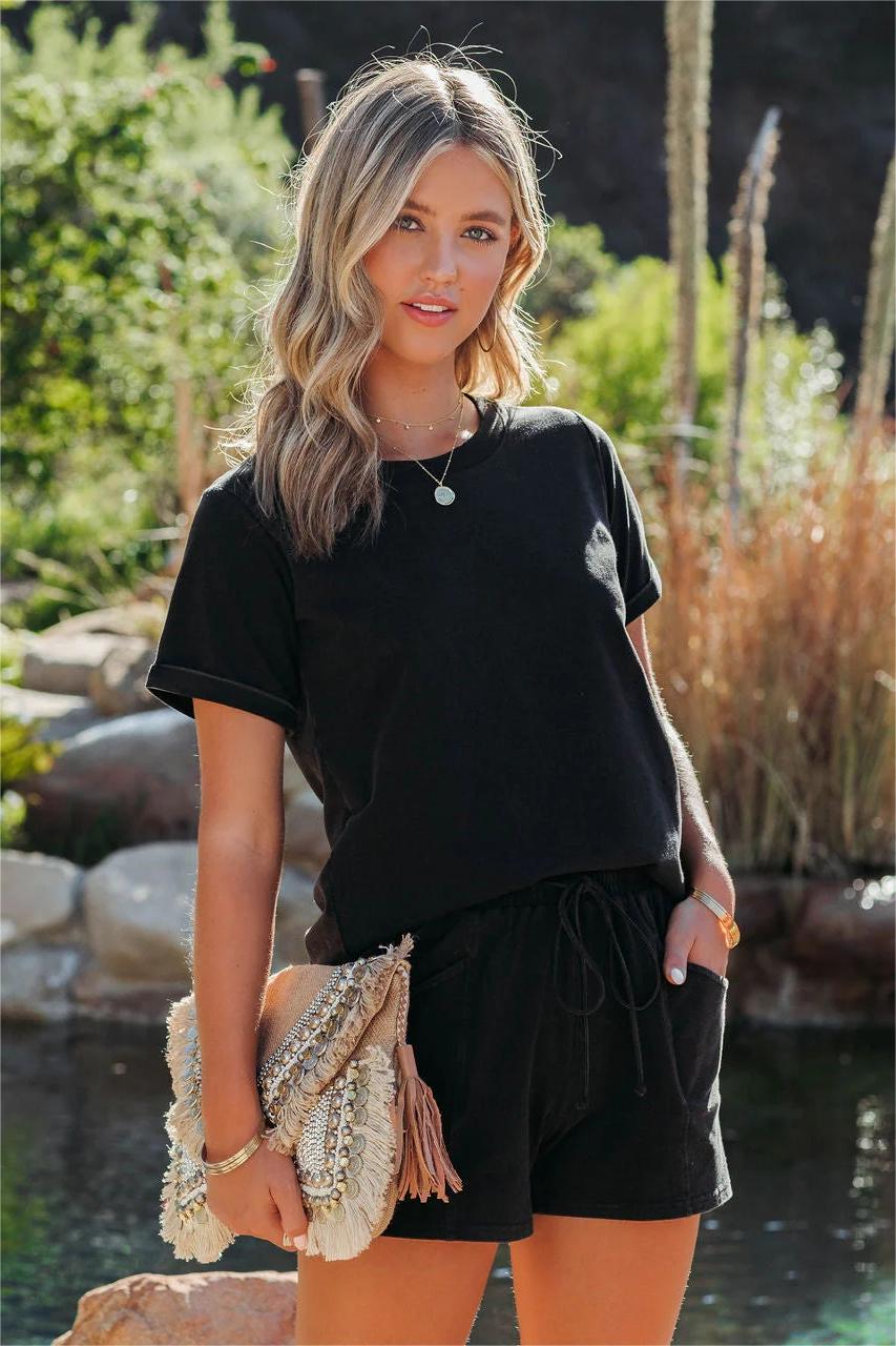 Lounge all day in the Saylor Cotton Blend Tee in a black vintage wash with a crew neckline.Styled with: Perfect Hoops. 5 Disc Choker. Compass Coin Necklace. Simple Bangle. Leela Clutch. Saylor Shorts. and Makenzie Sandal.