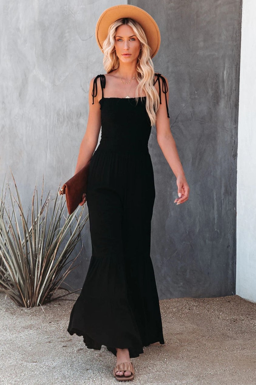 Designer dreams come true in the Sirius Smocked Bell Bottom Jumpsuit that exudes retro glamour in black.