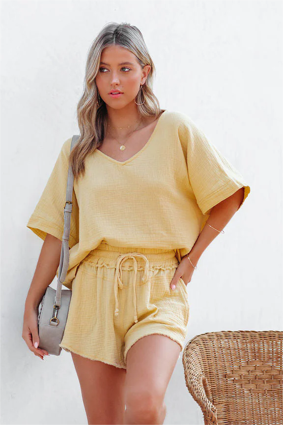 Warm weather 'fits made easy in the Sumner Cotton Pocketed Frayed Shorts in a crinkled yellow hue that pairs fab with the matching top and heeled sandals.