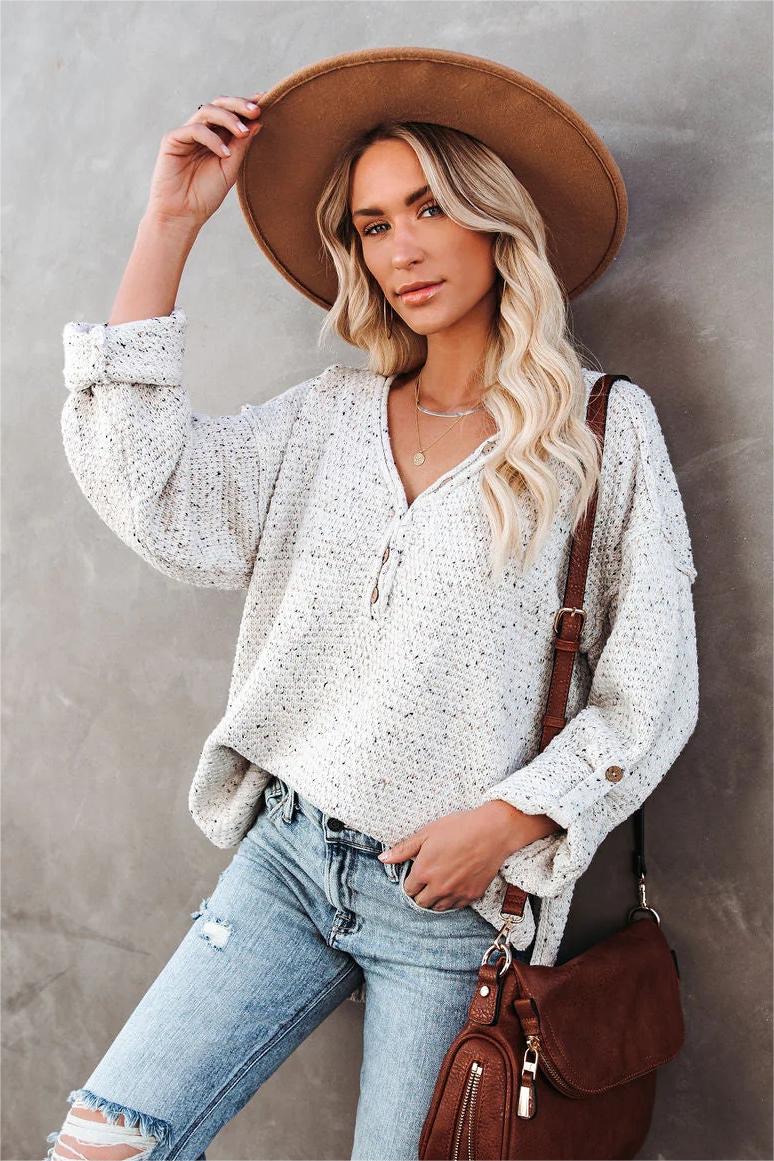 The Trev Speckled Knit Henley Sweater is such a classic! This oatmeal sweater has henley button closures and side slits in a thick knit fabric. Wear it with black denim. booties. and a hat. Styled with the El Dorado Hat. Perfect Hoop Earrings. Minimal Herringbone Necklace. Bali Necklace. Dandy Crossbody Messenger Bag. Rory High Rise Distressed Denim. and Ritz Faux Suede Pointed Heel.