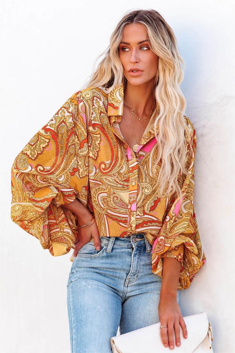Go for groovy in the Vrinda Printed Button Down Blouse with orange. yellow. ivory. pink. and red swirling hues and billowy sleeves.
