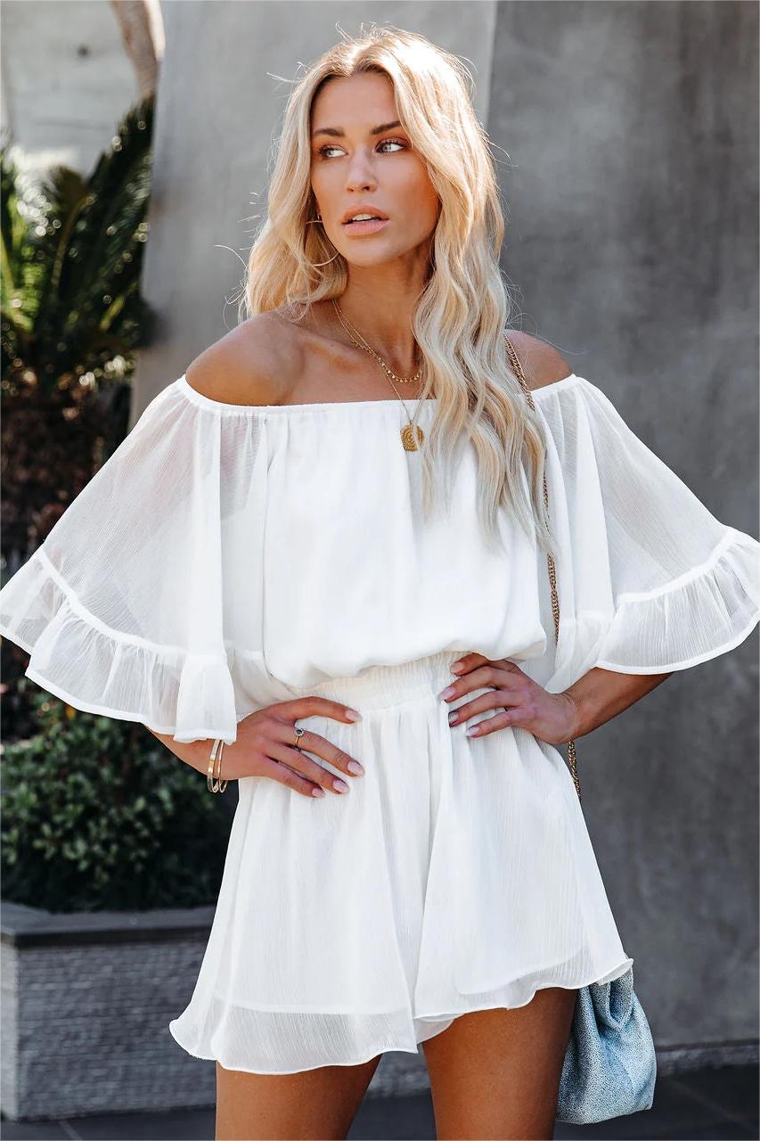 Sultry + sweet. the Definitely Demure Off The Shoulder Chiffon Romper is created in a white chiffon that drapes effortlessly on the figure.