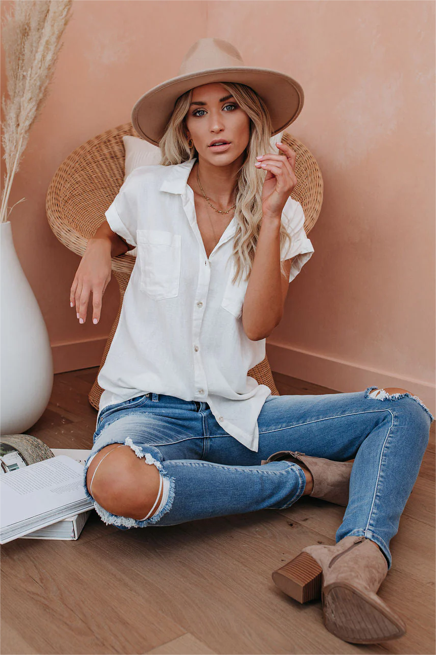 Our Brielle Linen Button Down Top features a relaxed fit with a classic shirt design.