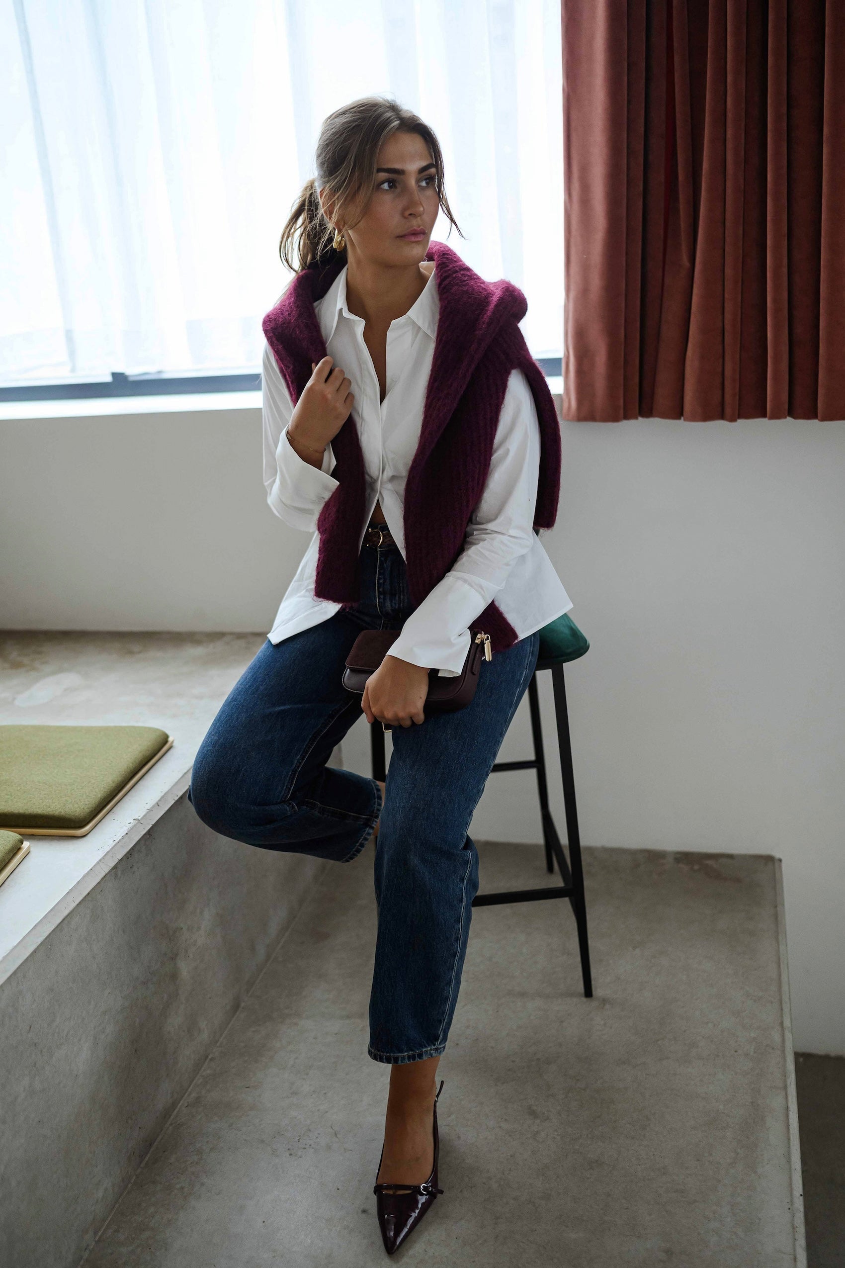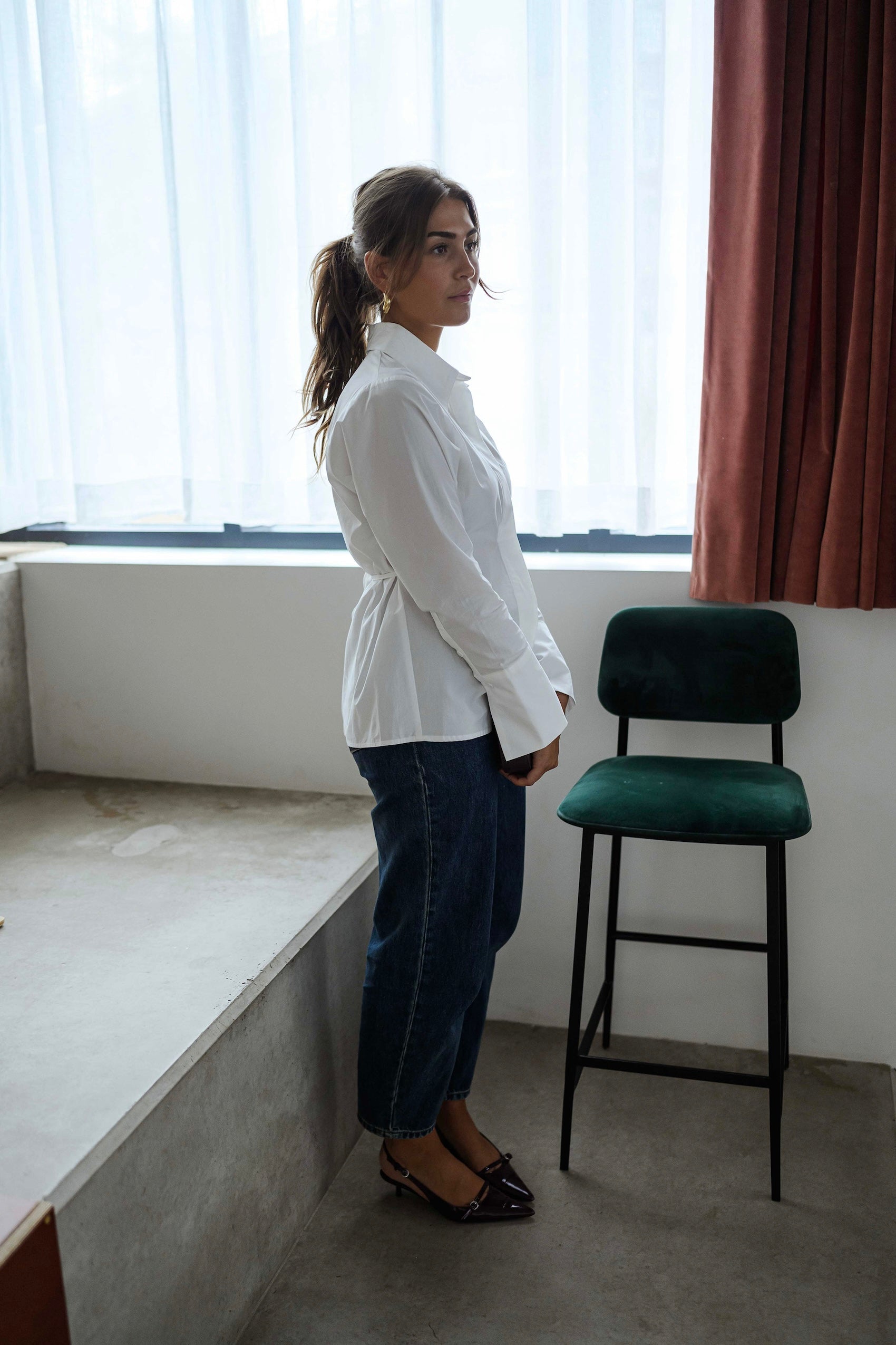 This White Evolene Shirt is designed with a traditional collar and button placket, featuring a back tie and a gently fitted shape that offers a chic and flattering fit.