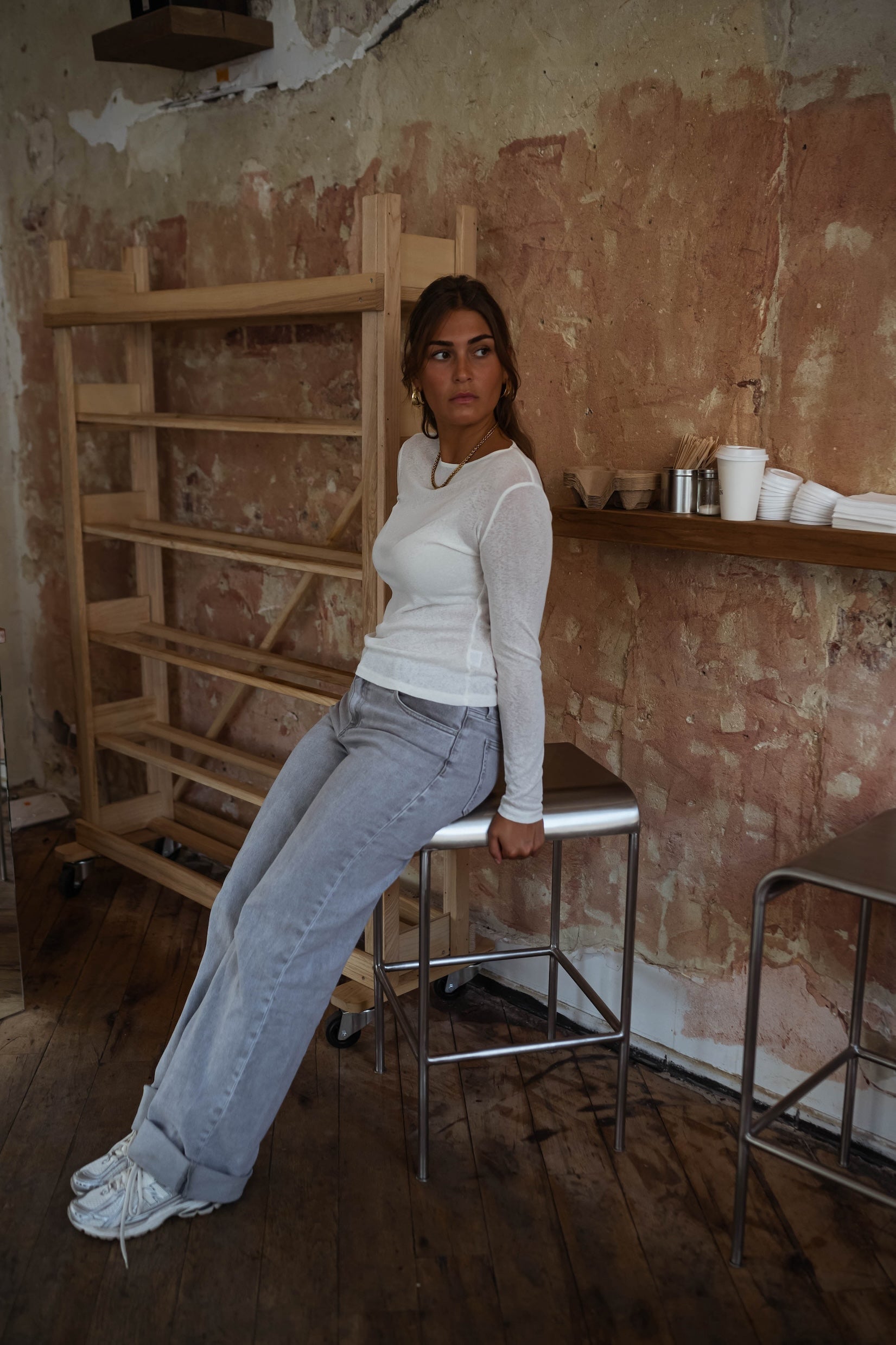 The Ecru Anne T-shirt is a fitted essential with a round neckline and long sleeves, perfect for layering or wearing on its own. Slightly transparent, it offers a refined touch that elevates a classic silhouette.